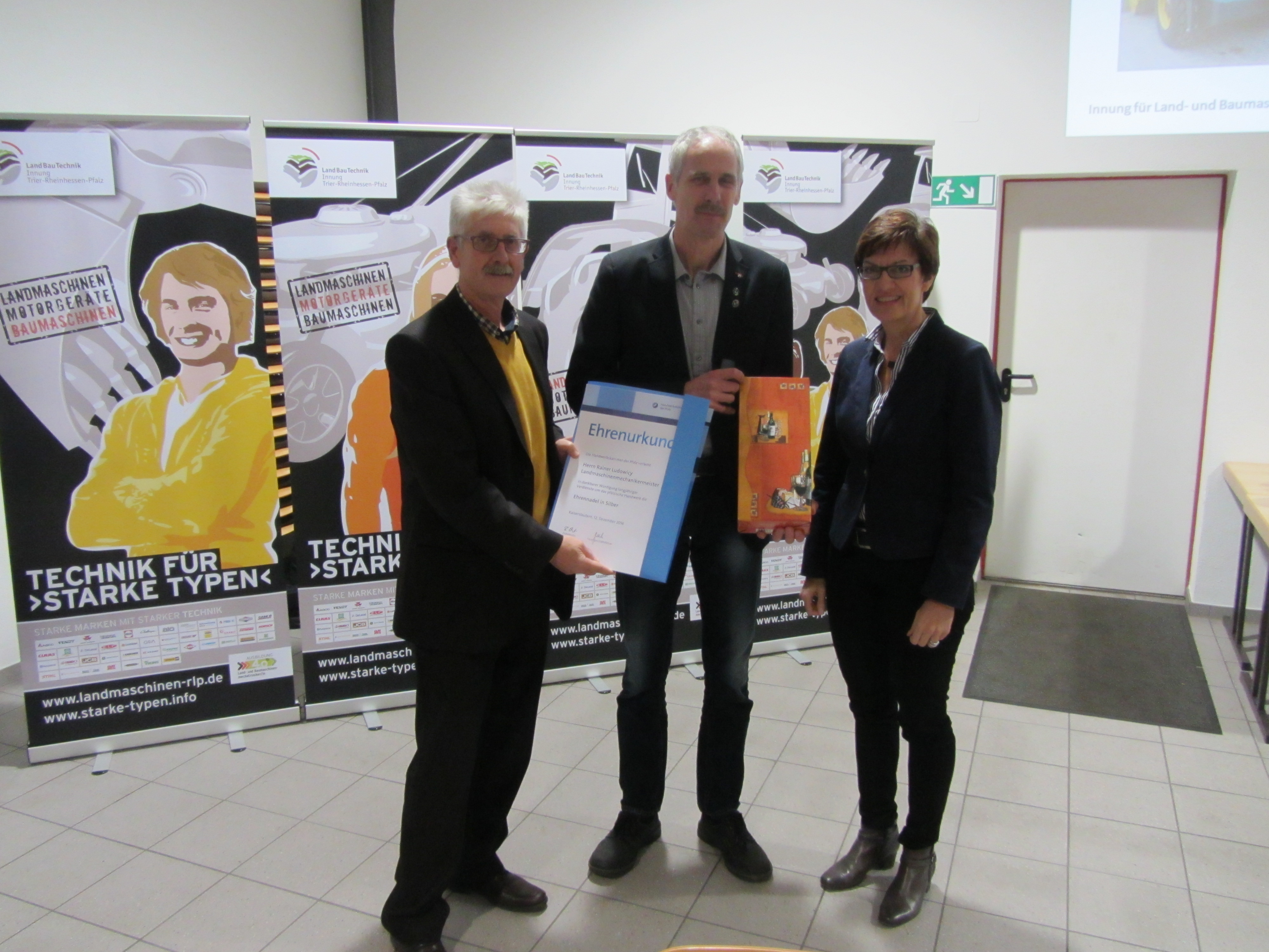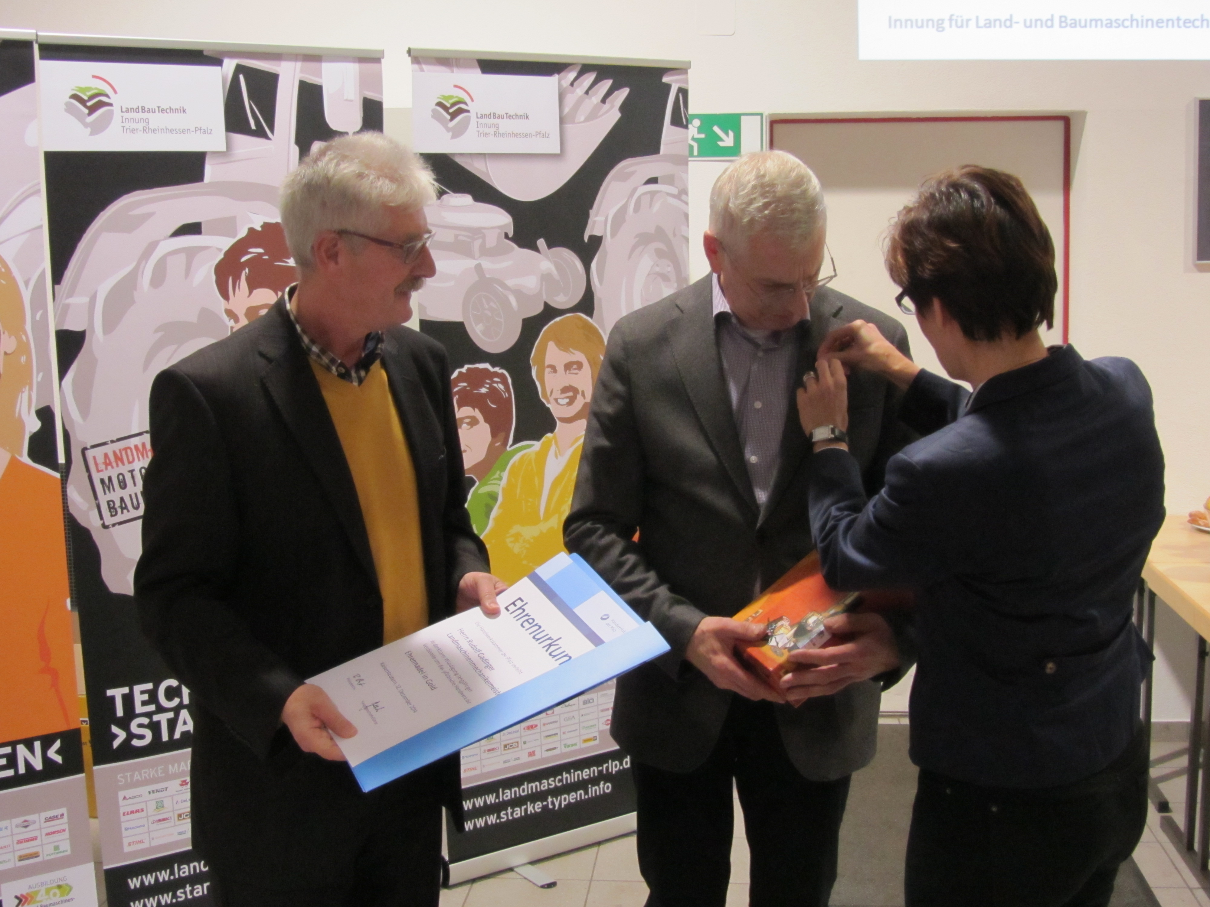 Aus den Händen des Leiters des BTZ der HWK Pfalz, Herrn Joachim Korn sowie seiner Kollegin Rita Petry erhielten OM Leo Thiesgen und LW Rainer Ludowicy jeweils die silberne Ehrennadel der HWK Pfalz für mehr als 15 Jahre Tätigkeit im Ehrenamt. Stv. OM Rudolf Gadinger erhielt die Ehrennadel in Gold, für über 25jähriges ehrenamtliches Engagement.